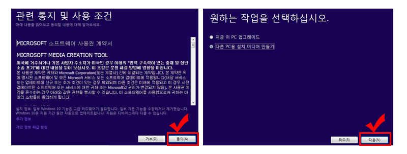 원하는 작업을 선택하십시오. 지금 현재 이 PC를 업그레이드 하는 방법과 다른 PC용 설치 미디어 만들기가 있는데 유에스비를 만들거니깐 다른 PC용 설치 미디어 만들기를 선택한후 다음으로 진행하여 줍니다.
