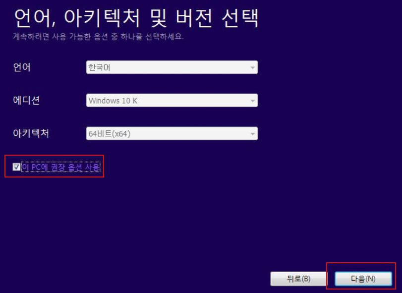 언어, 아키텍처 및 버전 선택 현재 이 PC에 권장 옵션을 자동으로 사용 또는 원하는 옵션으로 바꿔준후 다음 버튼을 눌러 계속 진행하여 줍니다.