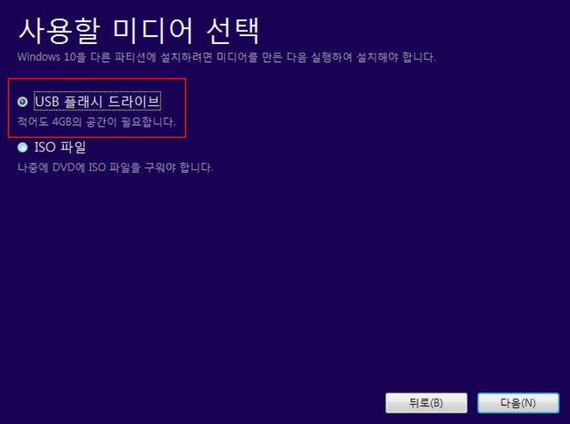 사용할 미디어 선택 USB 플래시 드라이브 또는 ISO 파일 항목이 뜨는데 유에스비에 바로 만들기 위해선 플래시 드라이브를 선택후 다음으로 넘어가 줍니다.