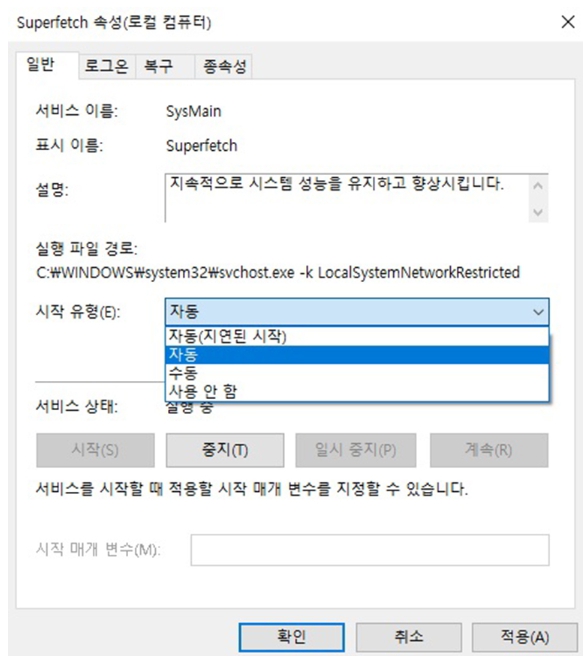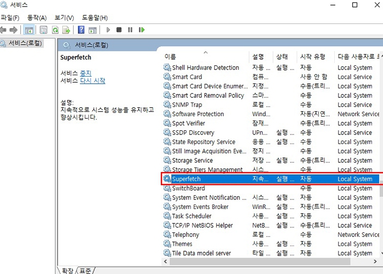 여기까지 진행하셨다면 Superfetch 사용 안 함 으로 되어 있습니다.